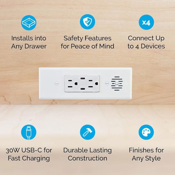 White 15 Amp Blade In-Drawer Outlet with (2) 30W USB-C and (2) AC Ports