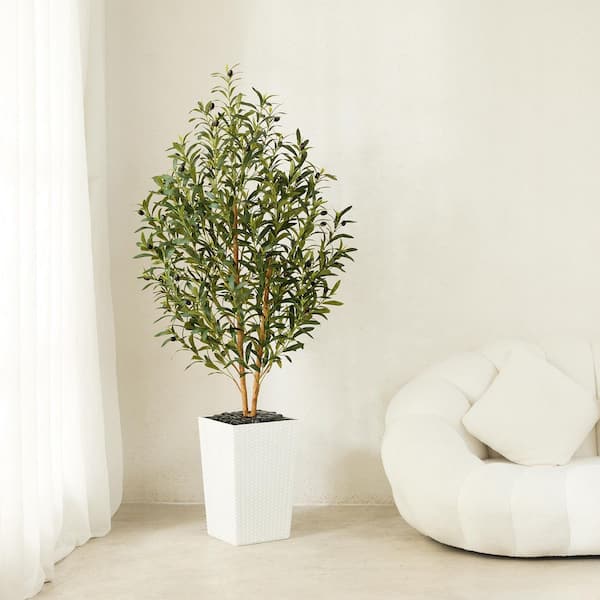 5 ft. Artificial Olive Tree Indoor/Outdoor White Planter,Real Wood Trunk,Faux Plants for Home Office Living Room Decor