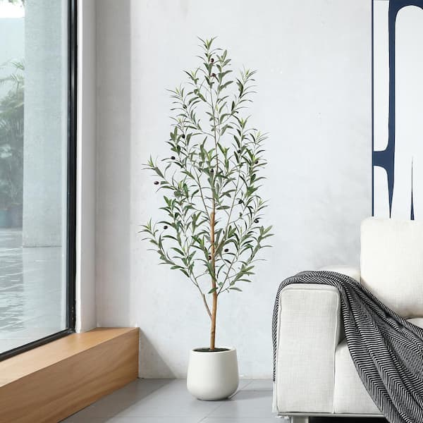 5 ft. Artificial Olive Tree with White Planter, Tall Faux Olive Trees with Natural Wood Trunk