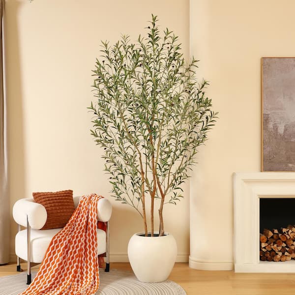 8 ft. Artificial Olive Tree with White Tall Planter, Faux Olive Tree with Natural Trunk