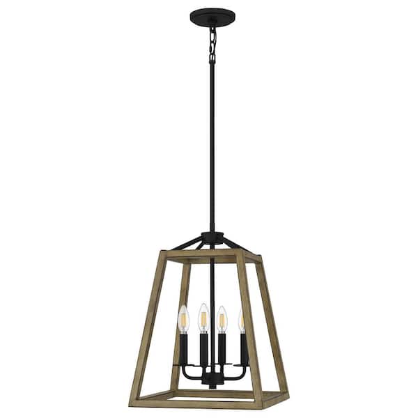 Roadhouse 4-Light Matte Black Gray Ash Wood Pendant with Metal Frame Shade