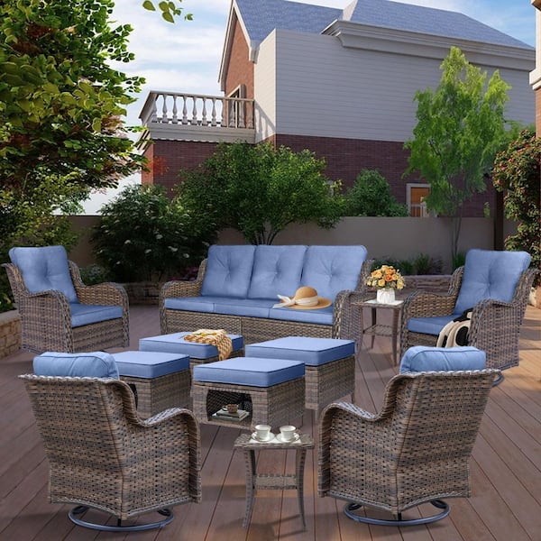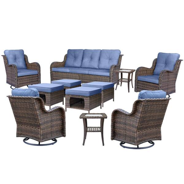 Brown 11-Piece Wicker Steel Patio Conversation Sofa Set Outdoor Rattan Furniture Set with Denim Blue Cushions