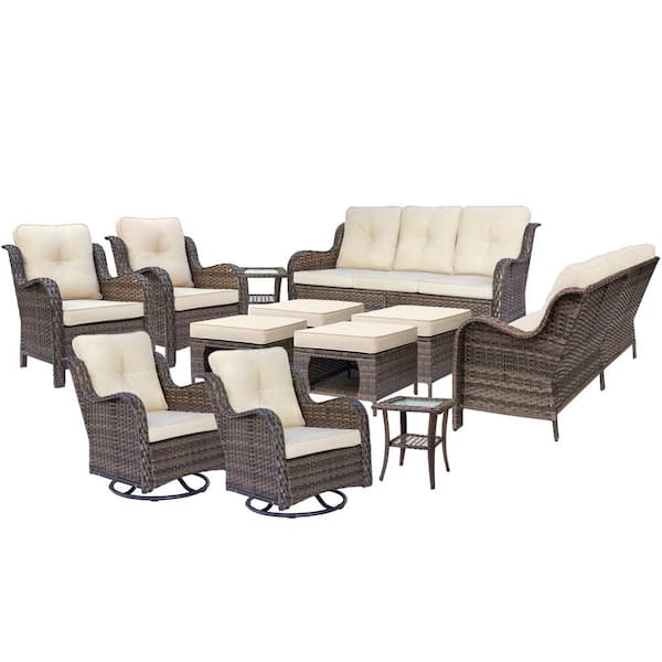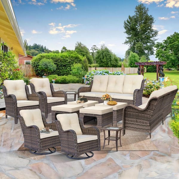 Brown 12-Piece Rattan Patio Conversation Set Lounge Sofa Chairs Swivel Rockers Ottomans Side Table with Beige Cushions