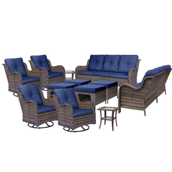 Brown 12-Piece Wicker Patio Conversation Seating Sofa Set Outdoor Rattan Swivel Chair with Navy Blue Cushion and Ottoman