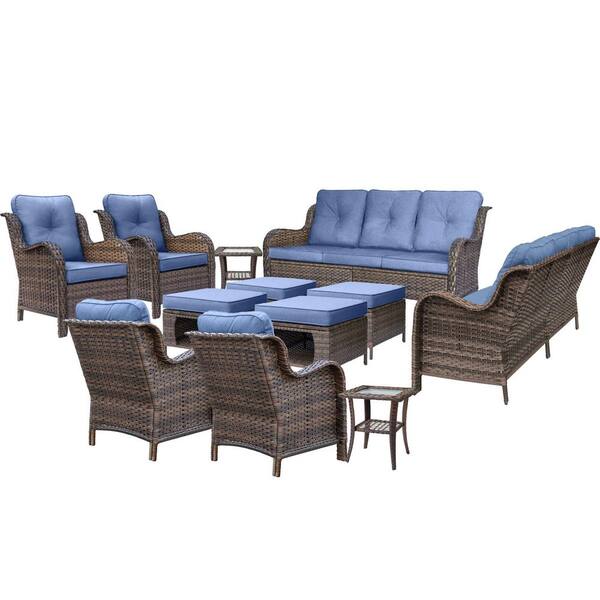 Brown 12-Piece Wicker Patio Furniture Set Outdoor Rattan Sofa Armchairs Ottoman and Side Table with Denim Blue Cushion