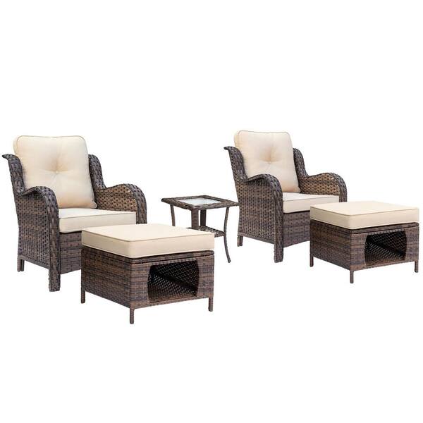 Brown 5-Piece Wicker Outdoor Armrest Chairs Patio Conversation Set with Ottomans Side Table Beige Cushions