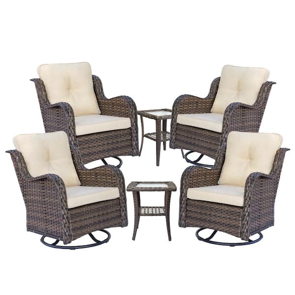Brown 6 Piece Wicker Patio Conversation Set Swivel Rocking Chairs with Side Table and Beige Cushions