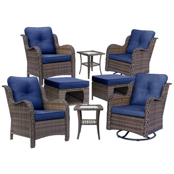 Brown 8-Piece Wicker Patio Swivel Chairs Outdoor Lounge Chairs Storage Ottoman Side Table with Navy Blue Cushions