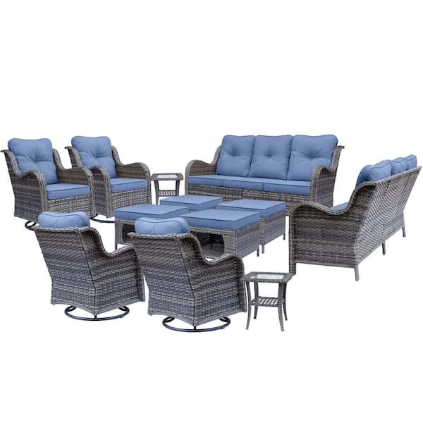 Gray 12-Piece Wicker Patio Conversation Seating Sofa Set Swivel Chairs with Denim Blue Cushions and Ottomans