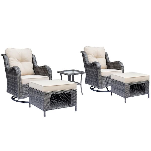 Gray 5-Piece Wicker Outdoor Swivel Rocking Chairs Patio Conversation Set with Ottomans Side Table Beige Cushions