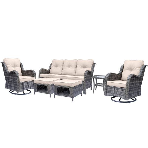 Gray 6-Piece Wicker Outdoor Patio Conversation Seating Sofa Set with Beige Cushions and Swivel Rocking Chairs