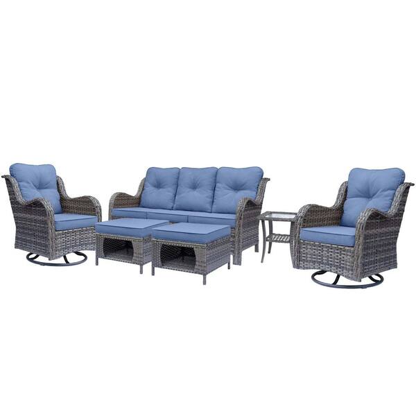 Gray 6-Piece Wicker Outdoor Patio Conversation Seating Sofa Set with Denim Blue Cushions and Swivel Rocking Chairs