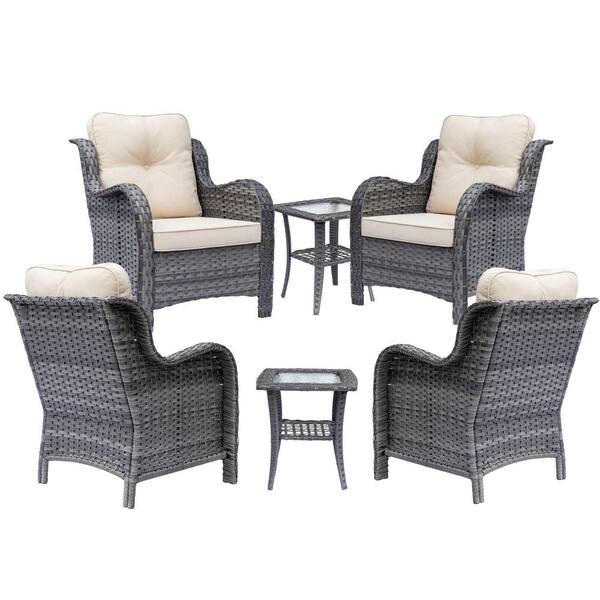 Gray 6-Piece Wicker Patio Conversation Set with Armrest Chairs Outdoor Rattan Side Table with Beige Cushions
