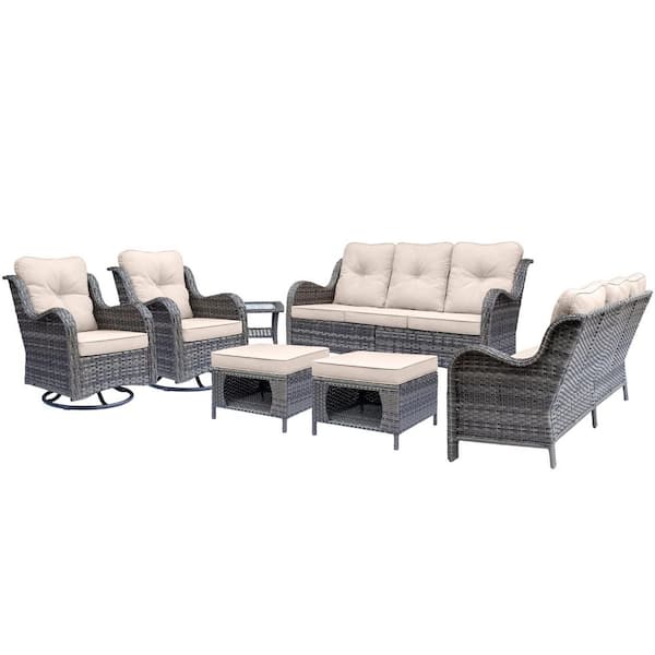 Gray 7-Piece Wicker Patio Conversation Sofa Seating Set with Swivel Chairs and Beige Cushions