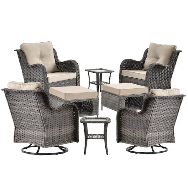 Gray 8-Piece Wicker Outdoor Swivel Rocking Chairs Patio Conversation Set with Beige Cushions and Ottomans