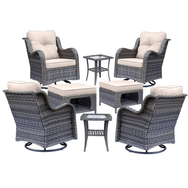 Gray 8-Piece Wicker Patio Conversation Set Swivel Rocking Chairs with Beige Cushions and Ottomans