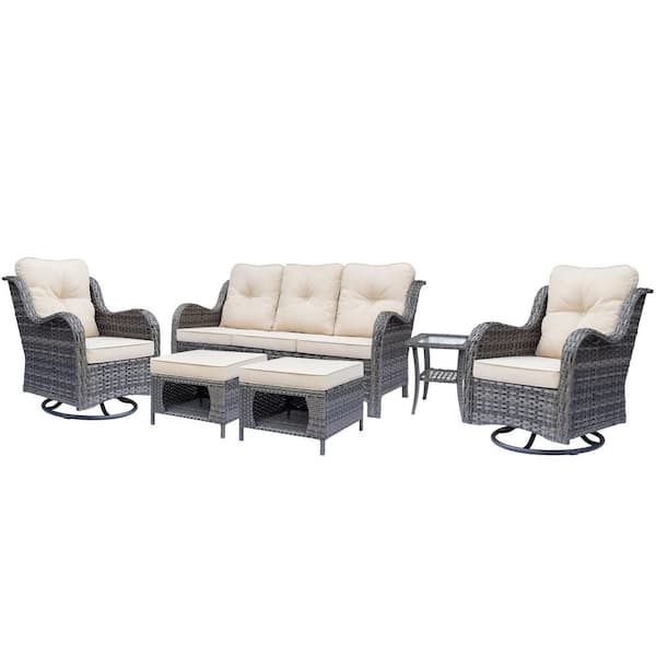 Gray 9-Piece Wicker Patio Conversation Set Sofa Seating Swivel Chairs with Ottomans with Beige Cushions and Covers