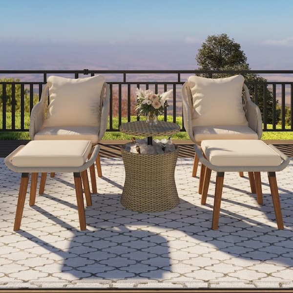 5-Piece Outdoor Patio Furniture Set in Brown with 1 Cool Bar Table, 2 Cushions, 2 Ottomans, 2 Single-Chair and Wood Feet