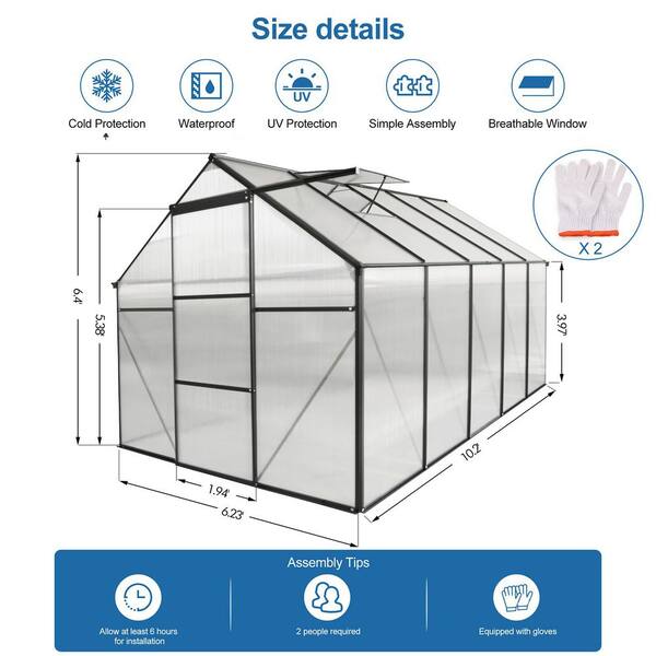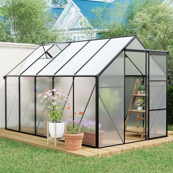6 ft. W x 10 ft. D, Single Sliding Door Polycarbonate Greenhouse Raised Base and Anchor Aluminum, in Black