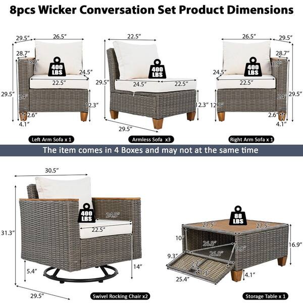 8-Piece Wicker Outdoor Patio Sectional Sofa Set with Beige Cushions, 2 Swivel Rocking Chair and 1 Acacia Storage Table