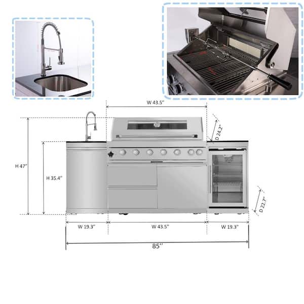 Deluxe 6-Burner 85000BTU Propane Grill Island 44 in. Stainless Steel Rotisserie, Refrigerator, Sink Cabinet, Gray