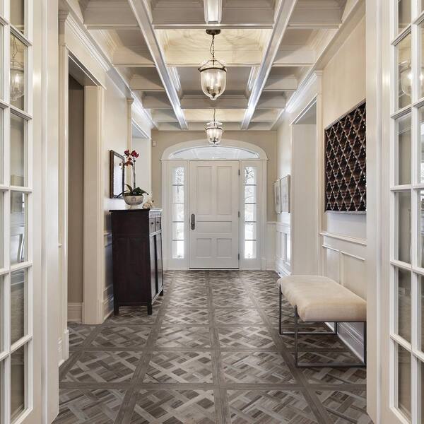 • Cinematic porcelain tile creates a classic parquet wood look