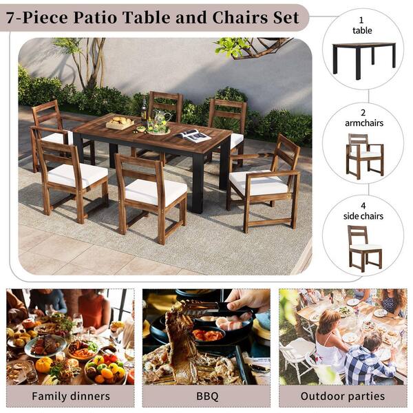 Dark Brown 7-Piece Acacia Wood Outdoor Dining Set with Armrest Chairs, Beige Cushions and Dining Table