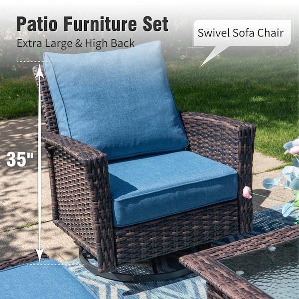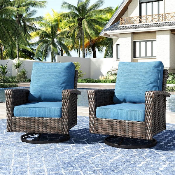 Dark Brown High Back Swivel Wicker Outdoor Lounge Chair with 5.5 in. Thick Blue Cushions (2-Pack)