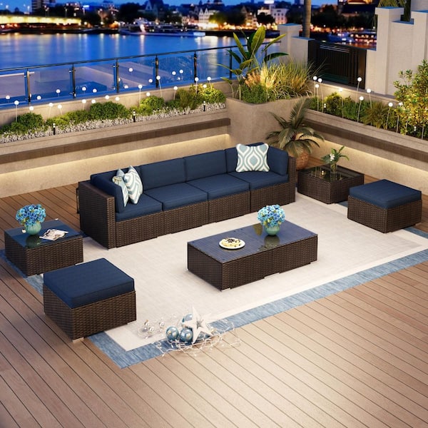 Dark Brown Rattan Wicker 6-Seat 10-Piece Steel Patio Outdoor Sectional Set with Blue Cushions,Ottomans and Coffee Tables