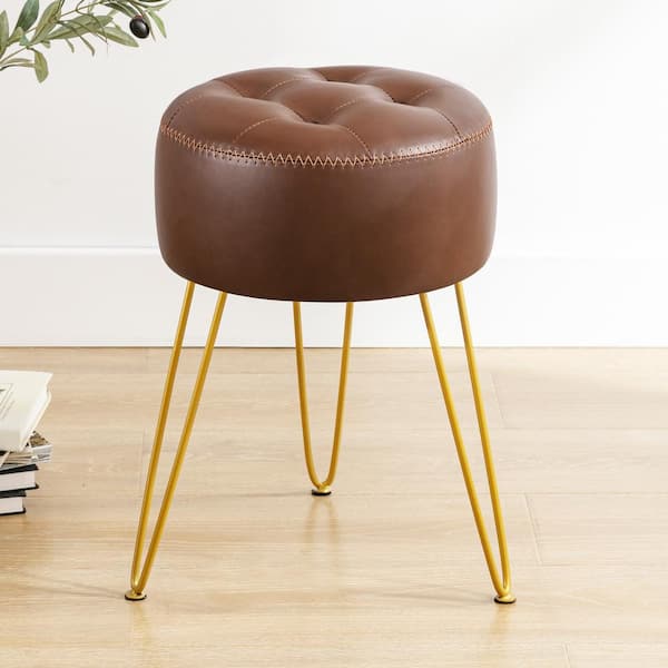 Dark Brown Tufted Faux Leather Vanity Stool with Metal Legs for Makeup Room