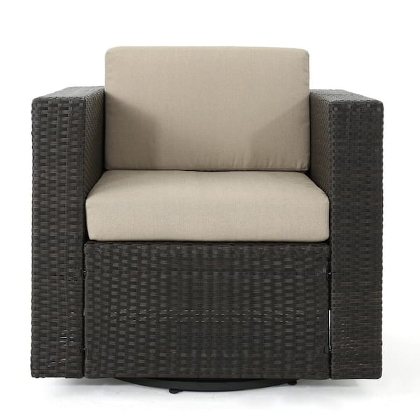 Dark Brown Wicker Outdoor Lounge Chair with Beige Cushions