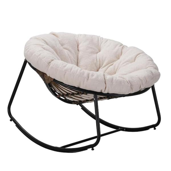 Dark Gray Wicker Outdoor Rocking Chair with Beige Cushions, Lounge Egg Chair for Indoor, Porch, Backyard and Balcony