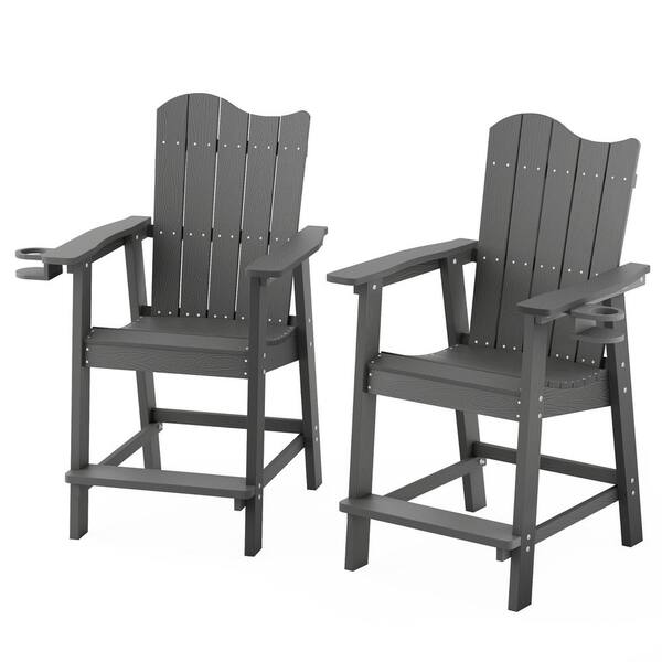 Dark Grey Plastic Adirondack Outdoor Bar Stool with Cup Holder Weather Resistant Wave Design Bar Chair(2-Pack)