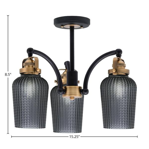 Decatur 16 in. 3 Light Black and Brass Semi-Flush with 5 in. Smoke Textured Glass Shade No Bulbs Included