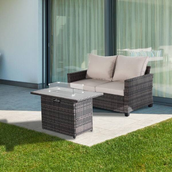 Outdoor Loveseat Sofa Beige Cushions with Metal Fire Pit Table