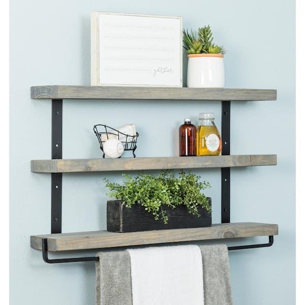 Industrial Grace 5.5 in. x 36 in. x 20 in. Gray Pine Wood 3-Tier with Towel Bar Decorative Wall Shelf with Brac