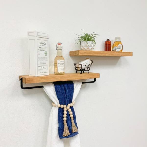 Del Hutson True Float 5.5 in. x 24 in. Walnut Pine Wood Floating Decorative Wall Shelf and Towel Bar Set with Brackets