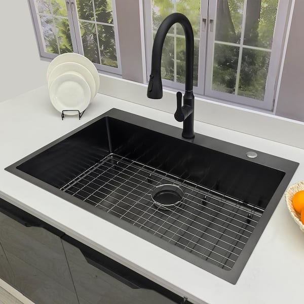 33 in. Black Drop-In Kitchen Sink-33 x 22 Top Mount Stainless Steel Sink, 16-Gauge Single Bowl with 4 Accessories