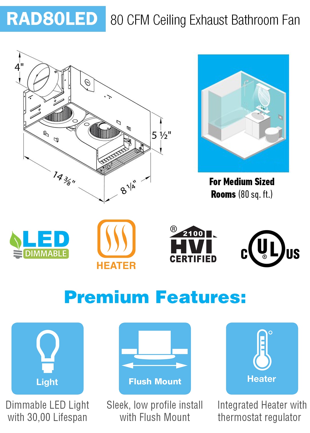 Imagine feeling nice and warm when coming out of the shower on a cold morning. The built-in thermostat regulates the temperature so that you are kept comfortably warm at all hours. The dimmable LED feature allows you to select the perfect lighting. The powerful yet quiet exhaust fan maintains proper indoor quality and keeps your mirror fog-free. The Breez Radiance RAD80LED delivers a luxious shower experience while reducing energy use and utility costs.