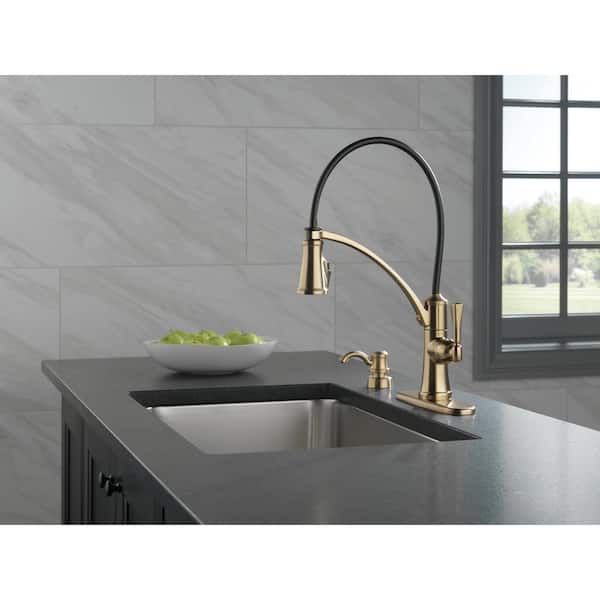 • Gold kitchen faucet backed by Delta’s Lifetime Limited Warranty