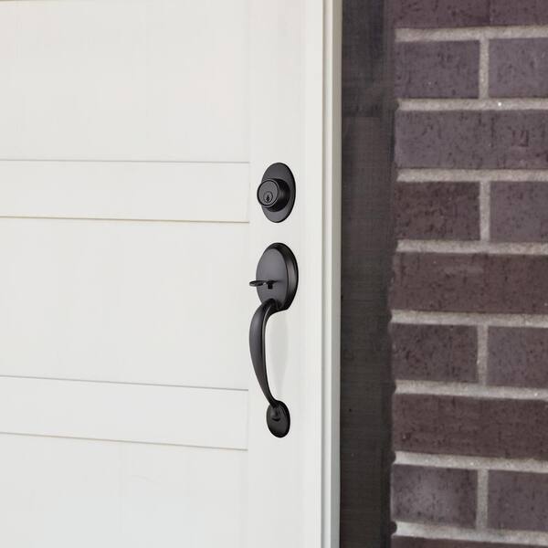 Coventry Matte Black Door Handleset with Springdale Handle Interior and Single Cylinder Deadbolt