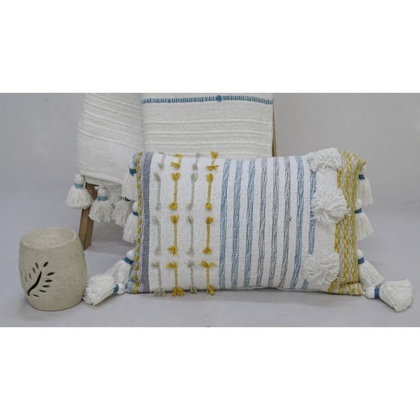 Designer Striped Pillow with Large Poms and Tassels 14 in. x 20 in.