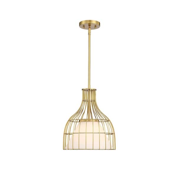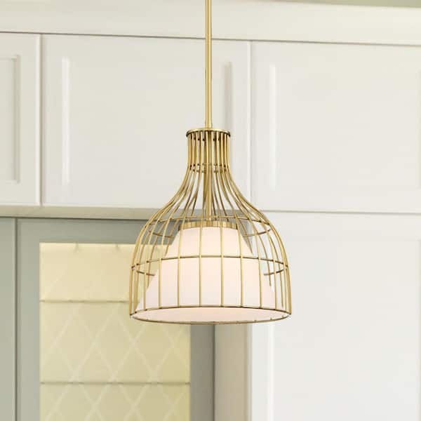Evensong 60-Watt 1-Light Brushed Gold Bell Pendant with Etched Opal Glass Shade and Metal Outer Cage