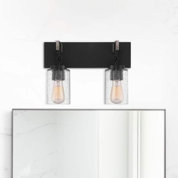 Fulton 15.5 in. 2-Light Matte Black Industrial Vanity Light with Clear Seedy Glass Shades