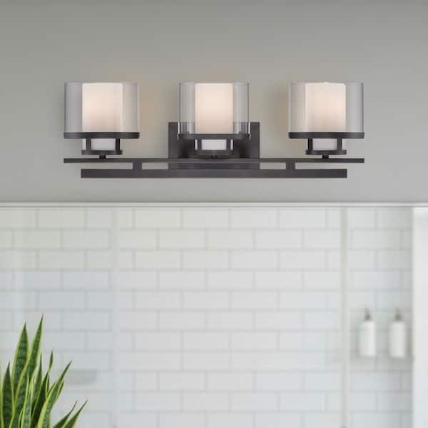 Fusion 24.25 in. 3-Light Biscayne Bronze Mid-century Vanity Light with Clear and Frosted Glass Shades