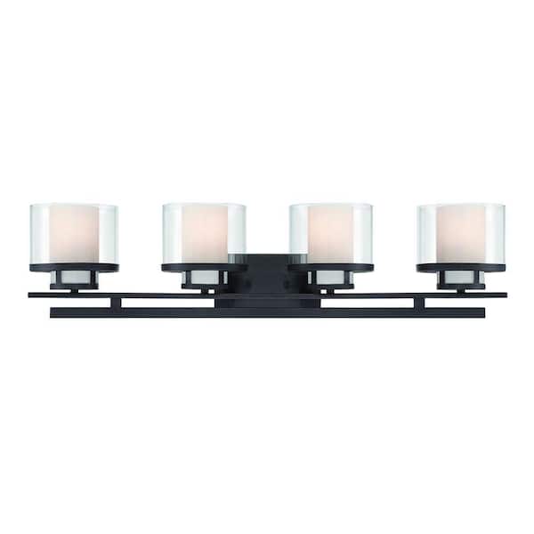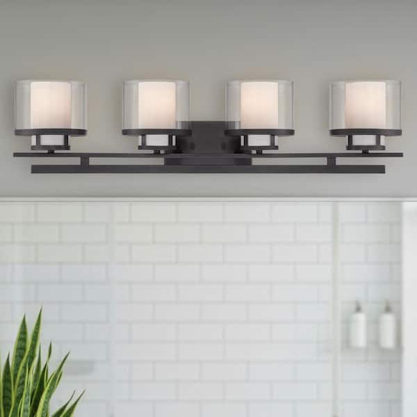 Fusion 35.75 in. 4-Light Biscayne Bronze Mid-century Vanity Light with Clear and Frosted Glass Shades