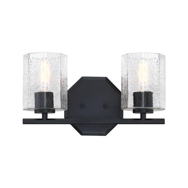 Haven 16 in. 2-Light Matte Black Modern Vanity Light with Clear Rippled Glass Shades