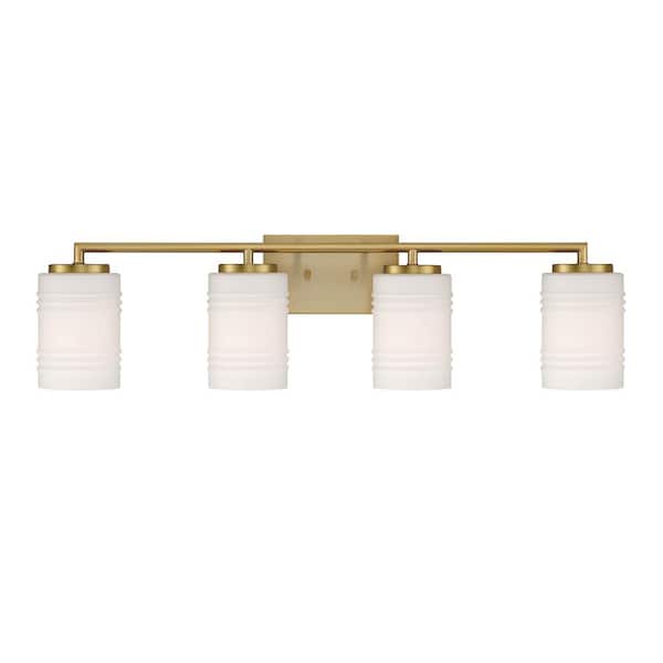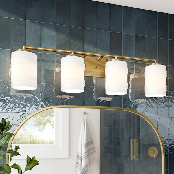 Leavenworth 33 in. 4-Light Brushed Gold Transitional Vanity Light with Etched Opal Ribbed Glass Shades