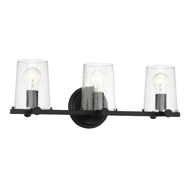 Matteson 24.75 in. 3-Light Matte Black Industrial Vanity Light with Clear Seedy Glass Shades