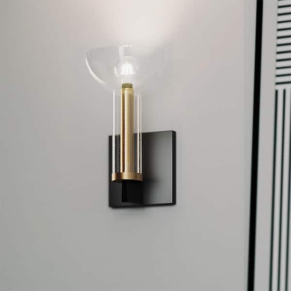 Nova 5 in. 1-Light Matte Black Modern Wall Sconce with Clear Seedy Glass Shade and Brushed Gold Accent
